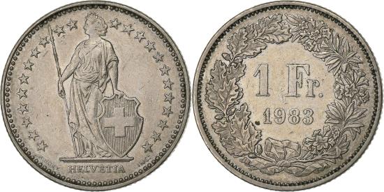 | | Switzerland, Franc, 1983, Bern, Copper-nickel, , KM:24a.3 | | | 23 Stars around figure, Value and date within wreath | | FEATURES |