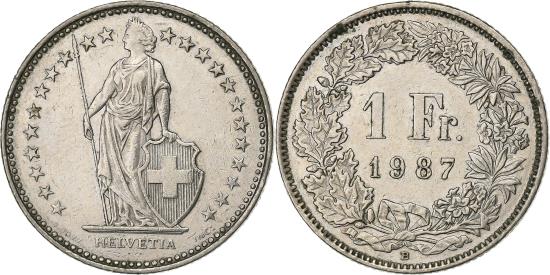 | | Switzerland, Franc, 1987, Bern, Copper-nickel, , KM:24a.3 | | | 23 Stars around figure, Value and date within wreath | | FEATURES |