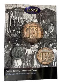 British Tokens and Passes, auction sale catalogue by Dix, Noonan & Webb, November 8, 2017, 811 lots, illustrated throughout in color, card covers. Near New.