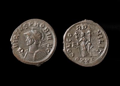 Probus Ae Antoninianus. Ticinum mint. VIRTVS PROBI AVG, radiate, helmeted, cuirassed bust l., holding shield and spear. Rev., CONCORD MILIT, Concordia standing l., holding two standards, mintmark PXXI in ex. RIC 481. 3.94g, 22mm. |