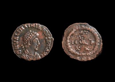 Valentinian II Ae4, 378-383 AD. Antioch mint. DN VALENTINIANVS PF AVG, pearl diademed, draped, cuirassed bust r. Rev., VOT-X-MVLT-XX in four lines within wreath, mintmark ANA in ex. RIC 65a. 1.19g, 13mm. |
