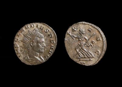 Claudius II Ae Antoninianus, 268-270 AD. Milan mint. IMP CLAVDIVS PF AVG, radiate, draped bust r. Rev., PAX AVG, Pax running l., holding olive branch and transverse sceptre, officina letter T in ex. RIC 157. 2.61g, 19mm. |