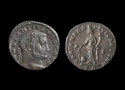 Constantius I Ae Follis. Trier mint. CONSTANTIVS NOB CAES, laureate head r. Rev., FORTVNAE REDVCI CAESS NN, Fortuna standing l., holding cornucopiae and rudder, globe at feet, A-star across fields, TR in ex. cf RIC 415. Very rare. 9.68g, 26mm. |