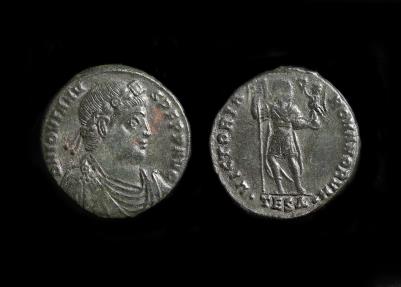 Jovian Ae1. Thessalonica mint. DN IOVIANVS PF PP AVG, laurel and rosette-diademed, draped, cuirassed bust r. Rev., VICTORIA ROMANORVM, emperor standing, head r., holding labarum and Victory on globe, mintmark dot TESΔ dot. RIC 238. 9.10g, 27mm. |
