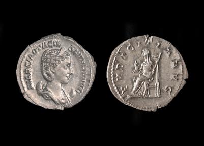 Otacilia Severa Ar Antoninianus. MARCIA OTACIL SEVERA AVG, diademed draped bust r. on crescent. Rev., PVDICITIA AVG, Pudicita seated left, raising veil, holding sceptre. RIC 123c; RSC 53.