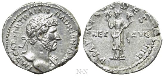 Obv: IMP CAESAR TRAIAN HADRIANVS AVG. Laureate bust right, with slight drapery. Rev: P M TR P COS DES III / AET - AVG. Aeternitas standing facing, head left, holding heads of Sol and Luna. RIC² 167. Condition: Extremely fine; luster in field. Weight: 3.54 g. Diameter: 19 mm. |