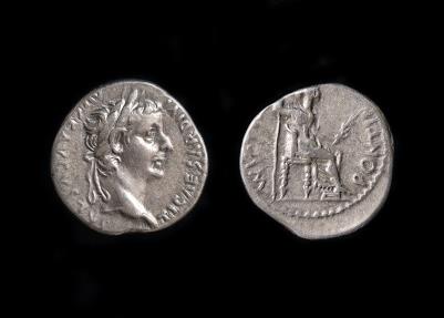 Tiberius Ar Denarius, 'Tribute Penny.' Lugdunum mint. TI CAESAR DIVI AVG F AVGVSTVS, laureate head r. Rev., PONTIF MAXIM, Livia, as Pax, seated right on chair with ornamented legs, holding long sceptre and olive branch, single line below. RIC 30; RSC 16a. 3.73g, 18mm. |