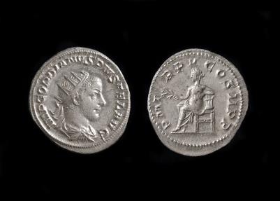 Gordian III Ar Antoninianus. IMP GORDIANVS PIVS FEL AVG, radiate, draped, cuirassed bust r. Rev., P M TR P V COS II P P, Apollo seated l., holding branch in r. hand, leaning on lyre behind. RIC 89; RSC 261. 4.85g, 23mm. |