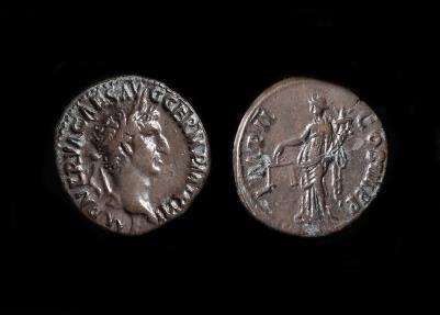 Nerva Ar Denarius, 98 AD. Rome mint. IMP NERVA CAES AVG GERM P M TR P II, laureate head r. Rev., IMP II COS IIII P P, Aequitas, draped, standing l., holding scales in r. hand and cornucopiae in l. RIC 44. Dark patina. 3.06g, 18mm. |