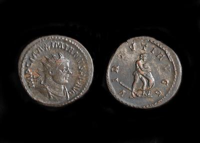 Maximianus Ae Antonininaus, 289 AD. Lyon mint. IMP C MAXIMIANVS PF AVG, radiate, cuirassed bust r. Rev., VIRTVTI AVGG, Hercules standing r., wrestling the Namean lion. RIC 454. 3.90g, 23mm. |
