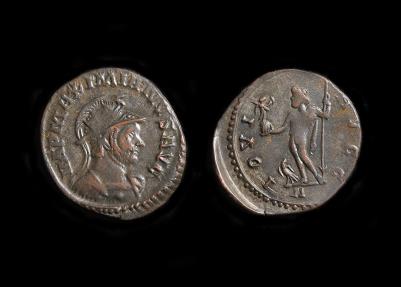 Maximianus Ae Antonininaus, 290-291 AD. Lyon mint. IMP MAXIMIANVS AVG, radiate, helmeted, cuirassed bust r. Rev., IOVI AVGG, Jupiter standing nude l., holding Victory on a globe in r. hand and inverted spear in l. hand, at feet, eagle standing, head looking backwards at Jupiter r., mintmark A in ex. RIC 384. 3.40g, 23mm. |