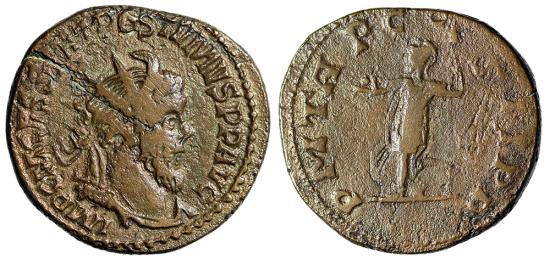 POSTUMUS AE DOUBLE SESTERTIUS Lugdunum Mint 261 AD Obverse: IMP CM CASS LAT POSTVMVS PF AVG Bust radiate, draped right, seen from front Reverse: P M TR P COS II PPS- C Mars standing left holding globe and spear References: Bastien 63. RIC 106 Scarce Size: 32mm, 24.31g Professional Numismatic Notes: Fine detail; a scarce type