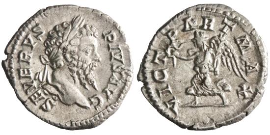 Roman: Septimius Severus (193-211), silver denarius (3.23g), Rome mint, 202 CE. Laureate head / Victory walking left, holding wreath and palm.
