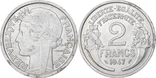 | | France, 2 Francs, Morlon, 1947, Paris, Aluminum, , Gadoury:538b | | | Morlon, Laureate head left, Denomination and date flanked by cornucopias | | FEATURES |