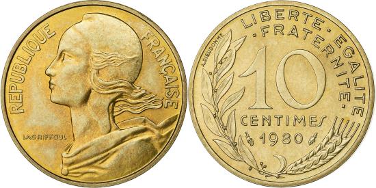 | | France, 10 Centimes, Marianne, 1980, Paris, Aluminum-Bronze, | | | Marianne, Liberty bust left, Denomination above date, grain sprig below, laurel branch at left, Without mint mark. 1991-1993 dated coins, non-Proof, exist in both coin and medal alignment., Henri Lagriffoul | | FEATURES |