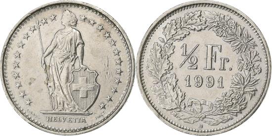 | | Switzerland, 1/2 Franc, 1991, Bern, Copper-nickel, , KM:23a.3 | | | 23 Stars around figure, Value within wreath | | FEATURES |