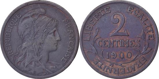 | | France, 2 Centimes, Daniel-Dupuis, 1900, Paris, Bronze, , Gadoury:107 | | | Draped bust of Liberty wearing a Phrygian cap over her long hair to the right, olive branch in front., Denomination and date between an olive branch, French motto around. | | FEATURES |