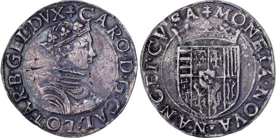 | | Duchy of Lorraine, Charles III, Teston, 1545-1556, Nancy, Silver, | | | Bust of Charles III wearing a crown, cuirass and high collar, right., Crowned shield of the Duchy of Lorraine. | | FEATURES |