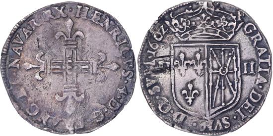 | | France, Henri IV, 1/4 Écu de Navarre, 1602, Saint-Palais, Silver, | | | Cross adorned with fleurs-de-lis., Crowned shield with the arms of France and Navarre. | | FEATURES |