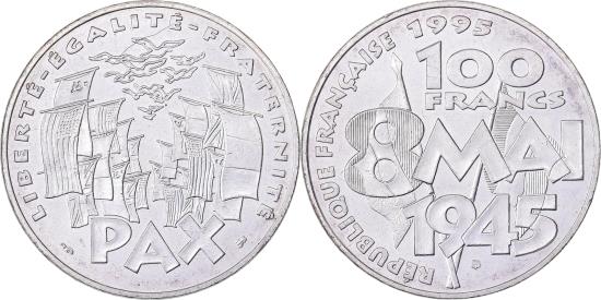| | France, 8 mai 1945, 100 Francs, 1995, Paris, , Silver, KM:1116.1 | | | 8 mai 1945, Victory in Europe date, May 8, 1945, Birds in flight above banners, PAX below | | FEATURES |