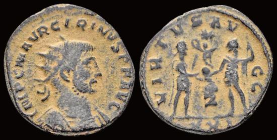 Carinus (283-285AD) AE antoninianus- 4,25 gram- 20 mm, Antioch mint, struck 282/3AD obv: IMP C M AVR CARINVS P F AVG, radiate and cuirassed bust right rev: VIRTVS AVGG, emperor standing right, holding sceptre and receiving globe with Victory, from Jupiter (or Carus) standing left, holding sceptre; star above, Z in centre field, XXI in exergue RIC 325 |