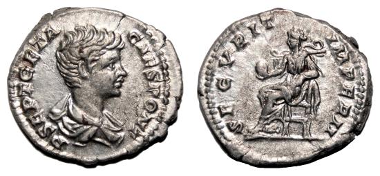 Obverse: P SEPT GETA CAES PONT. Bare headed, draped bust of Geta to right. Reverse: SECVRIT IMPERII. Securitas seated left on throne, holding globe.