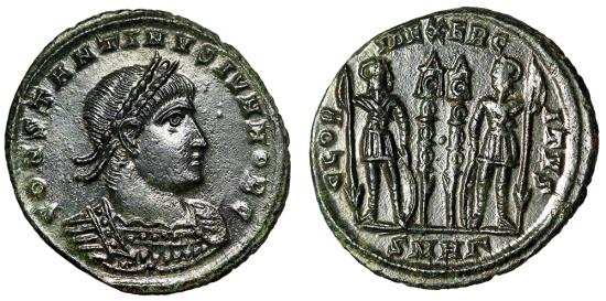 CONSTANTINE II CAESAR AE3 Heraclea Mint 330-335 AD Obverse: CONSTANTINVS IVN NOB C, laureate, cuirassed bust right Reverse: GLOR-IA EXERC-ITVS, two soldiers holding spears and shields with two standards between them; SMH(gamma) in exergue References: RIC 112 R4 Rare Size: 19mm, 2.84g Professional Numismatic Notes: Extremely-fine with a beautiful glossy pine-green patina!