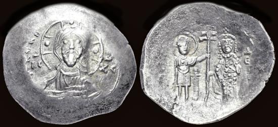 Alexius I Comnenus (1081-1118AD) Silver histamenon nomima- 4,25 gram- 27 mm, Thessalonica mint, Pre-Reform coinage, ca 1082-1092AD obv: + KЄ RO [AΛЄZIω] / IC – XC, facing bust of Christ Pantokrator rev: (ΔIMITI) ΔЄ[C]ΠI[TH], standing facing figures of St. Demetrius, nimbate, holding sword, handing patriarchal cross, set on globe and two steps, to Alexius, wearing crown and loros DOC 5a SB 1905 Rare in silver! |