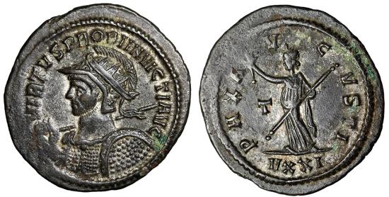 PROBUS SILVERED ANTONINIANUS Ticinum Mint 281 AD Obverse: VIRTVS PROBI INVICTI AVG, helmeted, radiate, cuirassed bust left, holding spear and shield Reverse: PAX AVGVSTI, Pax standing left, holding branch and transverse sceptre; T in left field; VXXI in exergue References: RIC 518 Scarce Size: 24mm, 3.63g Professional Numismatic Notes: Good very-fine with scarce obverse legends and an interesting portrait type!