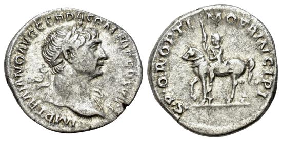 Trajan (98-117). AR Denarius. Rome, c. 112-3. R/ Trajan on horseback