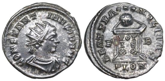 Constantine II A.D. 322-324 19mm 3.3g CONSTAN-TINVS IVN NC; radiate, draped [and cuirassed] bust right; seen from rear. BEAT TRA-NQLITAS; globe on altar inscribed VOT / IS / XX, three stars above; F-B across fields. In ex. PLON RIC VII London 253; LMCC 9.06.025