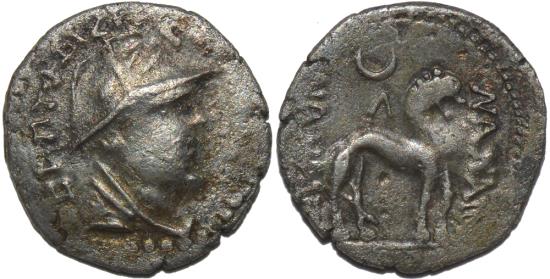 Lion standing right, tamgha above, legend at left and right: NANAIA