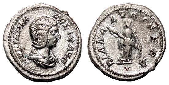 Obverse: IVLIA PIA FELIX AVG. Draped bust right. Reverse: DIANA LVCIFERA. Diana standing facing, head left, holding long torch with both hands. Excellent coin, in EF condition the obverse, a bit less the reverse, conserving full details on both sides, including a precious bust of Julia Domna on obverse. High quality silver with its original luster preserved. RIC 373A (Caracalla). Rome mint, circa AD 211-215. 3,3 g - 20 mm -------------------------------------------------------------------------------------------------- Visit our site about Numismatics and Archaeology: aeternitas-numismatics.com |