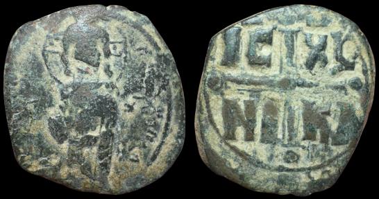 Byzantine Empire. Nicephorus Basilacius. AE Follis (10.65 gms), ca. 1078 AD. Thessalonica mint (?). C.f. Sear-1903. Obverse: Bust of Christ facing, wearing nimbus cruciger, pallium and colobium, raising right hand in benediction, holding Gospels in left hand; Reverse: IC–XC / NI–KA. Cross set on steps, pellet at each extremity. As found. VF. |