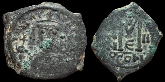 Byzantine Empire. Maurice Tiberius. AE Follis (10.98 gms), Year 2 (583/584 AD). Constantinople mint, 5th Officina. C.f. Sear-493; DOC-21. Obverse: Crowned and cuirassed bust facing, holding globus cruciger and shield; Reverse: Large “M”; cross above, ANNO Il across field; “€” (officina 5) below; CON in exergue. Light deposits. F. |