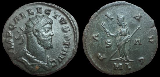 Roman-British Empire. Allectus. AR Antoninianus (3.98 gms), ca. 293-296 AD, Londinium Mint. RIC-28. Obverse: radiate, draped bust of Allectus right; Reverse: Pax standing left, holding olive branch and vertical sceptre. Superb surfaces and gorgeous patina. AU. Ex. Gerald Koloski collection, found metal detecting in Britain 1950s–1960s. Comes with collection ticket. |