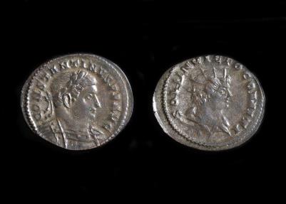 Constantine I Ae Follis, 310-313 AD. Treveri mint. CONSTANTINVS P F AVG, laureate, cuirassed bust r. Rev., SOLI INVICTO COMITI, radiate, draped bust of Sol r. RIC 893. 4.81g, 24mm. |