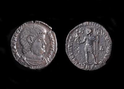 Magnentius Ae2, 350 AD. Trier mint. IM CAE MAGNENTIVS AVG, bare-headed, draped, cuirassed bust r. Rev., FELICITAS REIPVBLICE, Magnentius in military dress standing l., holding Victory on globe in r. hand and labarum in l. hand, A in r. field, TRS crescent in ex. RIC 266; Bastien 28; LRBC 51. 4.15g, 22mm. |