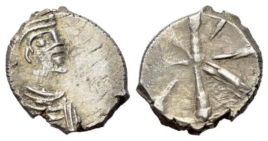Constantine IV Pogonatus (668-685). AR Half Siliqua. Italian mint. Helmeted, draped and cuirassed bust of Constantinopolis. R/ Large TX monogram. VERY RARE