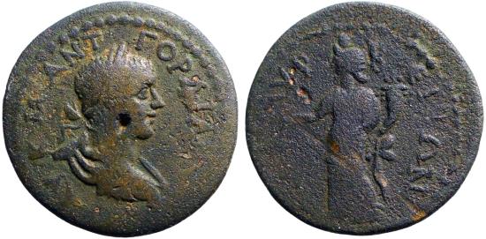 Gordian III AE26 Cilicia, Lyrbe. Tyche Obv: Laureate, draped and cuirassed bust of Gordian III, right, seen from rear. ΑΥ Κ Μ ΑΝΤ ΓΟΡΔΙΑΝΟϹ. Rev: Tyche standing left, holding rudder and cornucopia. ΛΥΡΒΕΙΤΩΝ. 238-244 AD. RPC VII. 2 2643. 9.45g. Rare. |