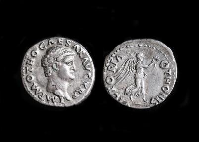 Otho Ar Denarius, 69AD. IMP M OTHO CAESAR AVG TR P, bare head r. Rev., VICTORIA OTHONIS, Victory, draped, flying r., holding wreath and palm. RIC 14; RSC 27; Sear 2164. 3.42g, 18mm. |