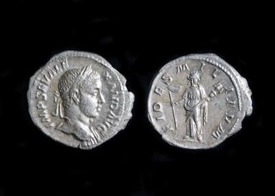 Severus Alexander Ar Denarius. IMP SEV ALEXAND AVG, laureate bust r. Rev., FIDES MILITVM, Fides standing r., holding vexillum and transverse standard. RIC 194; RSC 57.