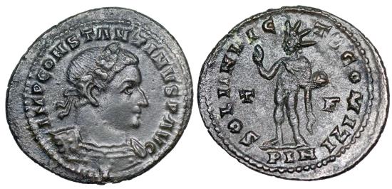 Constantine I A.D. 310 23x24mm 4.5g IMP CONSTANTINVS P AVG; laureate and cuirassed bust right. SOLI INVIC-TO COMITI; Sol rad., raising r. hand, globe in l.; stg. l., chlamys across l. shoulder, in fields T/F In ex. PLN RIC VI London 124; LMCC 6.02.014