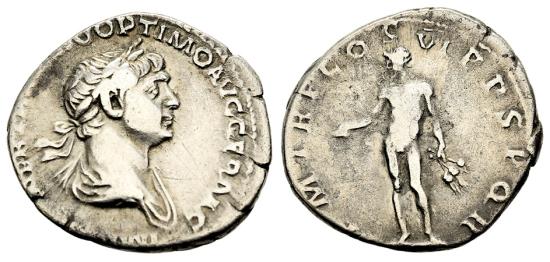 Trajan, 25 January 98 - 8 or 9 August 117 A.D. RS116581. Silver denarius, Woytek 518v, Hunter II 176, RIC II 347, RSC II 276, BMCRE III 549, SRCV II 3149, aVF, toned, flow lines, obv. off center, scratches, edge cracks, 3.164g, 19.6mm, 180o, Rome mint, IMP CAES NER TRAIANO OPTIMO AVG GER DAC (Latin: Imperator Caesar Nervae Traiano Optimo Augustus Germanicus Dacicus - Supreme commander, caesar, Nerva Trajan, the best emperor, conqueror of the Germans, conqueror of the Dacians), laureate and draped bust right; reverse P M TR P COS VI P P S P Q R (Latin: Pontifex Maximus Tribunicia Potestate Consul Sextum Pater Patriae Senatus Populusque Romanus - high priest, holder of Tribunitian power, consul six times, father of the country, the senate and the Roman people), Genius or Bonus Eventus standing slightly left, head left, nude, patera in right hand, two heads of grain and one poppy downward in left hand In Roman religion, every man has a genius, a presiding spirit. In De Die Natali, Censorinus says, from the moment we are born, we live under the guard and tutelage of Genius. Cities, organizations, and peoples also had a genius. On coins, we find inscriptions to the Genius of the Roman people, of the Senate, of the Emperor, etc. |