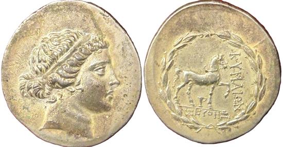 Head of Amazon Kyme / Horse prancing right; one-handed cup below, raised foreleg.