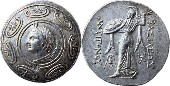 to cast thunderbolt; crested Macedonian helmet to inner left, monogram