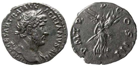 (3.20 gm; 18 mm). Rome mint, Struck 119-122 AD. Laureate bust right, drapery on far shoulder / Victory flying right, carrying trophy. RIC II 396; RSC 1131. Well struck on a nice full flan. Well centered. Choice EF. Lightly toned.