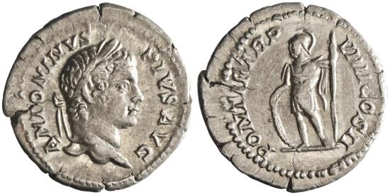 Roman: Caracalla (198-217), silver denarius (3.14g), Rome mint, 206 CE. Laureate draped bust / Mars in military dress standing left leaning on shield holding reversed spear.