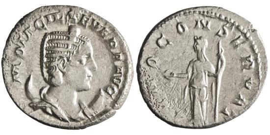 | Roman: Otacilia Severa (244-249), silver antoninianus (3.12g), Rome mint, 244-249 CE. Diademed, draped bust on crescent / Juno standing left, holding patera and sceptre. |