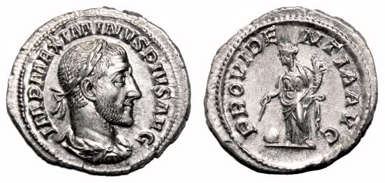 Obverse: IMP MAXIMINVS PIVS AVG. Laureate and draped bust to right. Reverse: PROVIDENTIA AVG. Providence standing left holding cornucopiae and wand pointed at globe at foot. Superb specimen, practically uncircullated, in EF+ condition, conserving full details, including a superb bust of Maximinus Thrax, very bold reliefs and high quality silver with its original luster well preserved. RIC IV-2 13. Rome mint, A.D. 235. 2,7 g - 20 mm